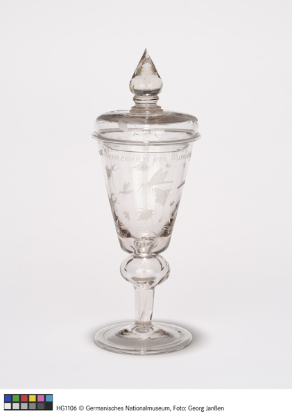 Bei Glas flippe ich ja eh aus. Hier steht ein Deckelpokal mit Insektendarstellungen aus der ersten Hälfte des 18. Jahrhunderts neben einem meiner Lieblingsgläser von Peter Behrens, in die ich mich schockverliebte, als ich sie zum ersten Mal sah. Ich glaube, das war in den 1980er Jahren im Kaiser Wilhelm Museum in Krefeld. Erst viel später habe ich entdeckt, dass die in Köln Ehrenfeld gefertigt wurden. Die Rheinische Glashütten AG (vormals Rheinische Glashütten-Actien-Gesellschaft in Ehrenfeld bei Cöln) war eine der bedeutendsten Glashütten im Rheinland Ende des 19. Jahrhunderts bis Anfang 20. Jahrhundert.