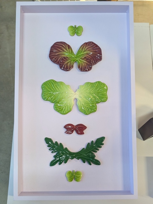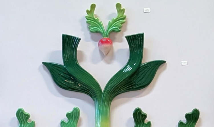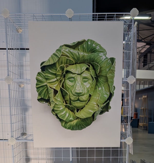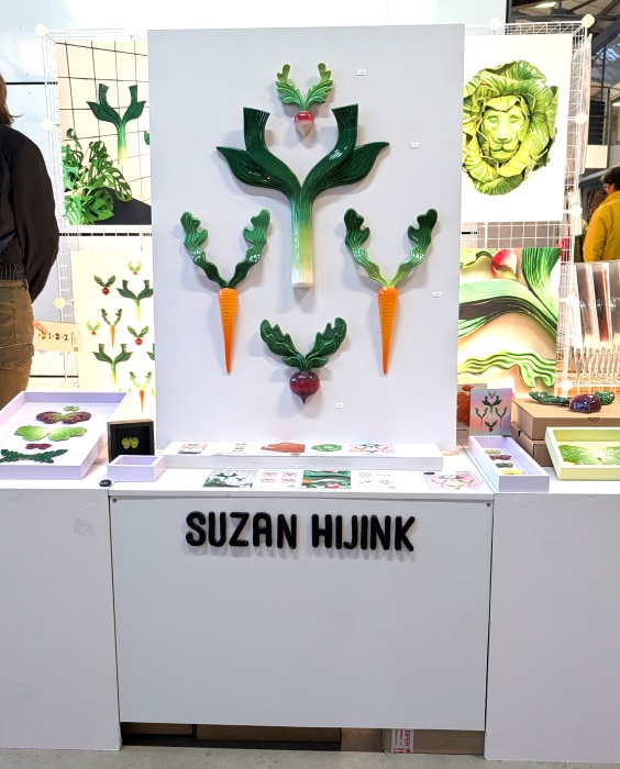 Suzan Hijink produziert Gemüseobjekte aus Keramik und erschafft Kombinationen aus Pflanzen und Tieren: Gemüse mit Geweihen, Salatblätter wie Schmetterlinge. Ihr Vater ist Jäger und so kam sie wohl schon früh mit diesem Geweihschädeln in Berührung. Die Salat-/Löwenkopf Skulptur erinnert an das Geschirr und die Terrinen aus dem Barock. Mir gefällt, wie sie aus biografischen und historischen Gegebenheiten etwas Neues kreiert. Die Keramiken entstehen als Kleinserien oder auf Anfrage und sind handbemalt.