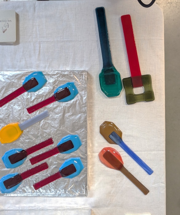 Die Salatbestecke und Vorlegelöffel aus Glas von Saudade Collective hatte ich auch schon im letzten Jahr gesehen, mir aber diesmal genauer angeschaut. Ich weiß nicht, wie das in meinen Kopf kam, aber im ersten Moment dachte ich, die seien aus Zucker. Wäre das nicht eine clevere Idee? So käme die Süße direkt beim Umrühren in die Speisen und irgendwann wären die Löffel aufgebraucht. OK, die Süße wäre vermutlich schlecht zu steuern. Also aus Glas. Mir gefallen die Farben und experimentellen Formen, allerdings würde mich das Geschepper und Geklirre nerven – wenn man nur Salatschüsseln aus Glas oder Keramik hat, wie ich.